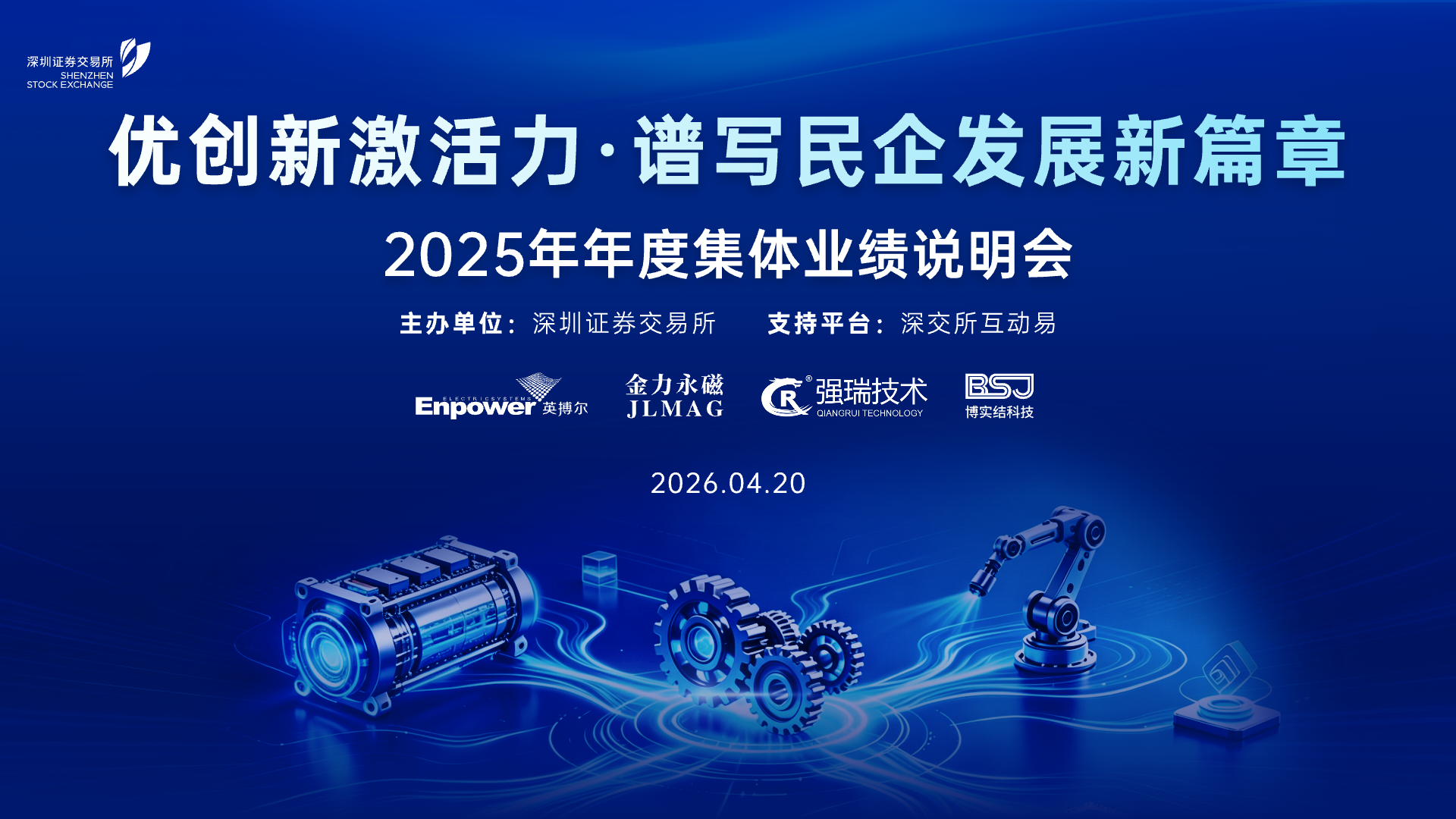 4月20日,深交所将以“优创新激活力·谱写民企发展新篇章”为主题,组织召开深市民营上市公司集体业绩说明会,邀请英搏尔、金力永磁、强瑞技术、博实结等公司参加。届时,各家公司将与投资者沟通交流,解析公司业绩,回答投资者提问,倾听意见建议,帮助投资者深入了解公司。欢迎广大投资者持续关注、积极参与。